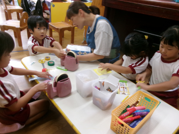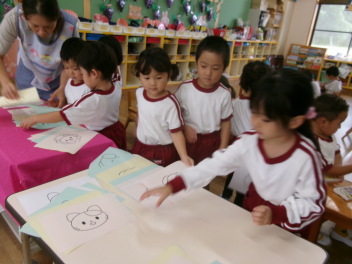 • 年中ぱんだ組さんは、運動会のダンスの時に使う腕飾りを作りました。