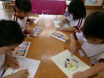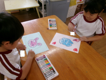 「うさぎ」「ひよこ」「ねこ」「らいおん」「ぞう」「ぱんだ」の絵にクレヨンで色を塗りました。黄色いひよこ、ピンクのうさぎ、青いぞう、カラフルならいおんなどができ上りました。その周りには、ハートや星、草など好きなものを描きました。