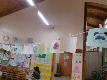 出来上がったら、保育室の上に紐をつけて飾ってみました。