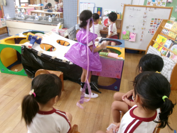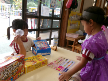 自分の好きなお店をつくって、物を売ったり買ったり、ゲームをしたりしています。店は、「お化け屋敷」「もぐらたたきゲーム」「アイス屋さん」「ペンダント屋さん」「ジュース屋さん」「駄菓子屋さん」があります。お店のユニフォームも身に付けてお店屋さんごっこを楽しんでいます。