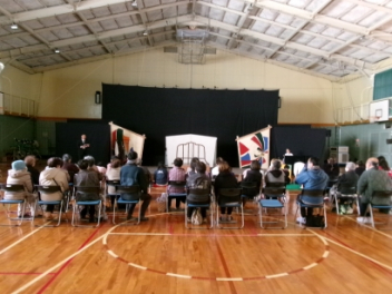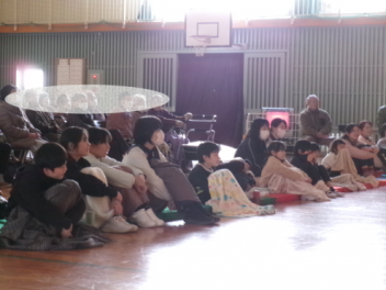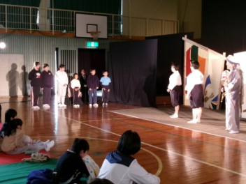 今日は社会福祉協議会の三世代交流事業として、体育館で観劇が行われました。