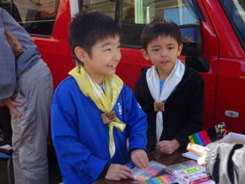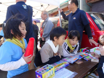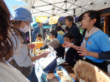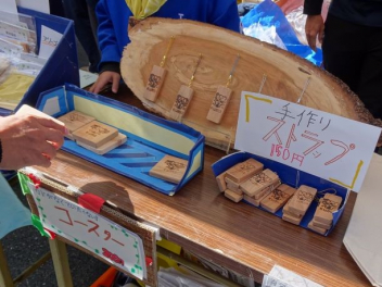 販売品は、桧や桜の木を利用したコースターとストラップ、草木染のバンダナとハンカチ、タオル、トートバック、オリジナルシールくじです。