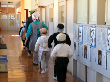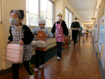 小学校では、全員で給食の配膳・片付けをします。まずは並んで食缶や食器などを1階までとりに行きます。