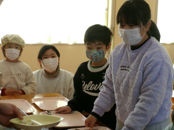 全学年で配膳です。2年生も上手に配っています。低・中・高と学年団でおかずの量が違います。それを考えながら配膳するのも上手になりました。