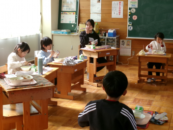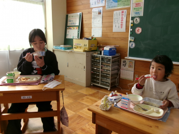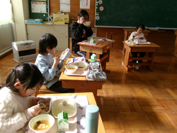 配膳が終わったらみんなで喫食。全校児童で食べることができるのも熊小ならでは。