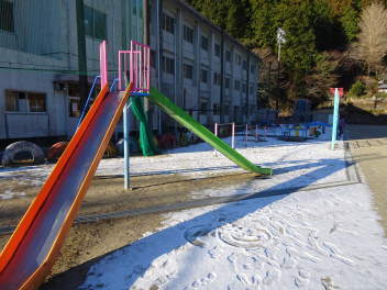• 日曜に降った雪がまだ残る運動場。朝はまだ氷点下。
