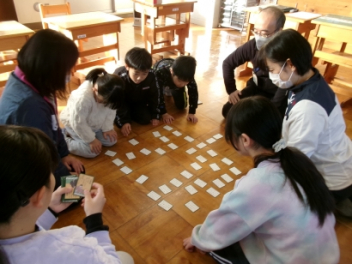読み聞かせのあとは、ボランティアさんと一緒に百人一首に挑戦。
