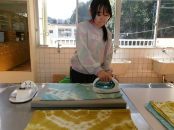 6年生が草木染をしたタオルとバンダナにアイロンがけをしてくれました。