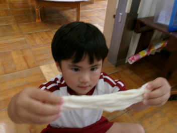 今回は長縄を使って遊びました。幼稚園の子の番になると、縄の動かし方を調整してくれました。