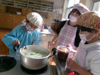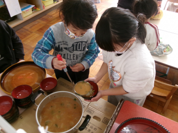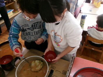 「小学生になると自分でよそうんだよ」「先に具を入れてから汁を入れるよ」と教えてもらい、チャレンジしてみました。