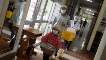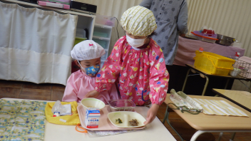 実はぞう組さん、小学校での給食体験後から、小学生の真似をして給食を持ちに行ったり、配膳をしたりしています。