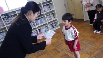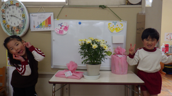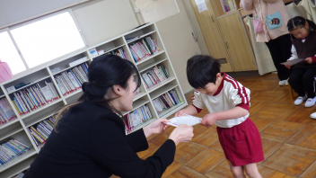 修了式の中で進級祝い品を貰ったひよこ組さんとうさぎ組さんは、とっても嬉しそうsad