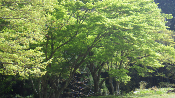 ずっと薄暗い道でしたが、青々と茂るモミジの葉っぱがキラリと見え、パッと明るくなりました。