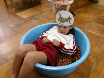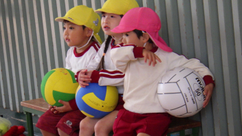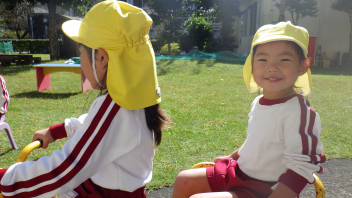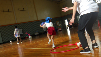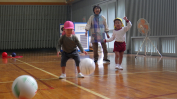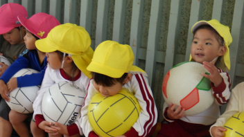 うさぎくみさんとひよこ組さんは、ボール遊びをしました。