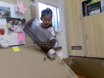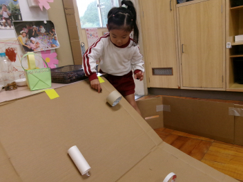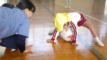 ころころ転がしながら走ったり、友達の真似をしたりして、先生や友達とボールに触れてたっぷり遊びました。