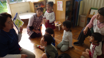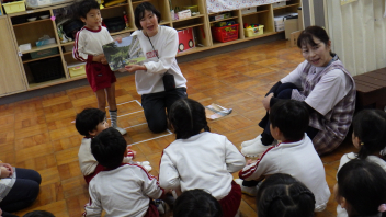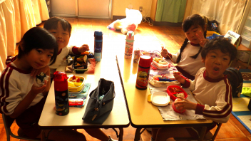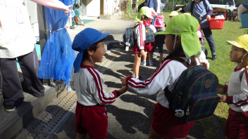 年長さんは靴を脱ぐ場所や熊幼稚園のことを、下・上阿多古幼稚園の友達に教えました。