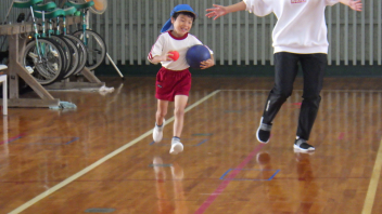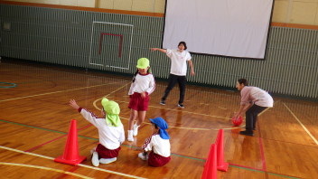 友達と気合を入れて宝を取りに行きますが、先生チームにタッチされ、なかなかうまくいきません。