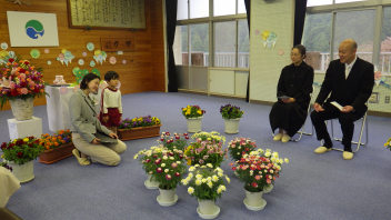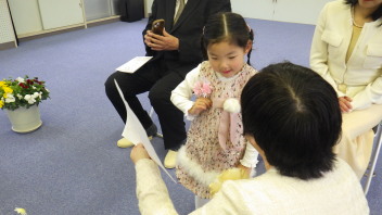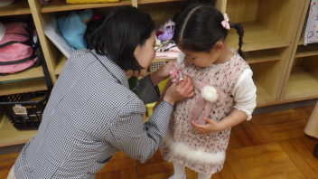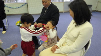 年少さんがおうちの方と登園し、先生にコサージュをつけてもらいました