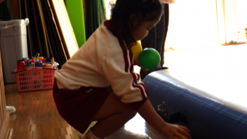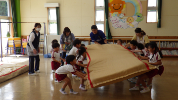 初めての体験。曲と二俣幼稚園の友達の動きに合わせて、1つのバルーンを動かしたよ!