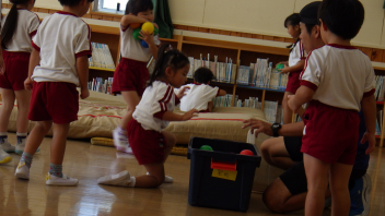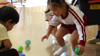 うさぎくみさんとひよこ組さんは、ボール遊びをしました。