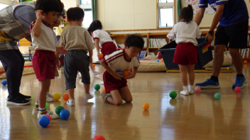 ころころ転がしながら走ったり、友達の真似をしたりして、先生や友達とボールに触れてたっぷり遊びました。