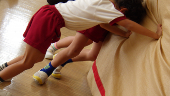 友達と気合を入れて宝を取りに行きますが、先生チームにタッチされ、なかなかうまくいきません。