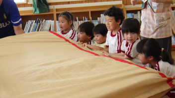 年長さんは靴を脱ぐ場所や熊幼稚園のことを、下・上阿多古幼稚園の友達に教えました。