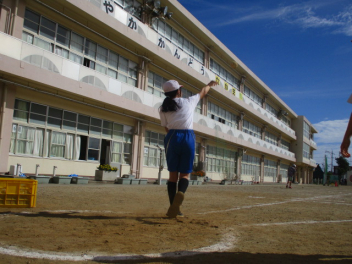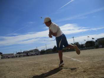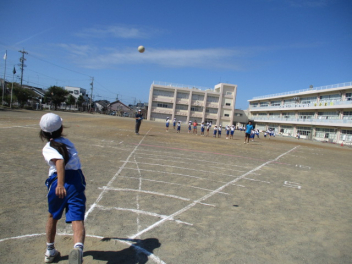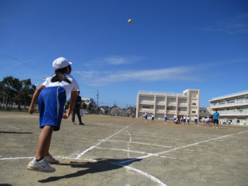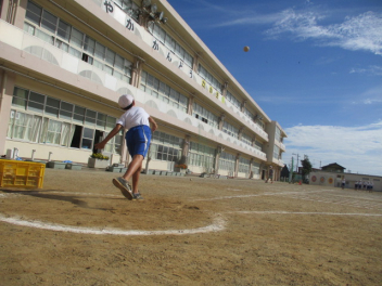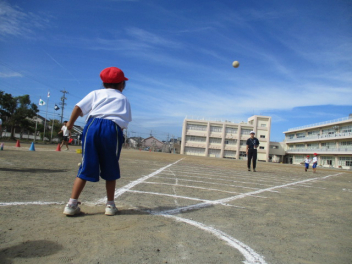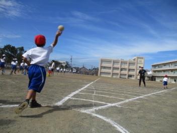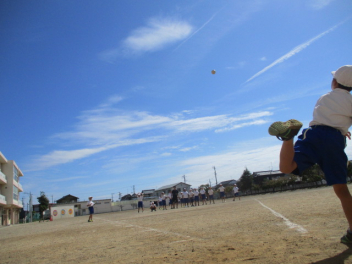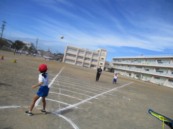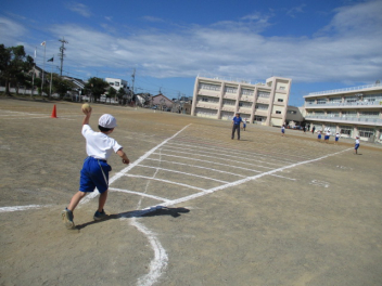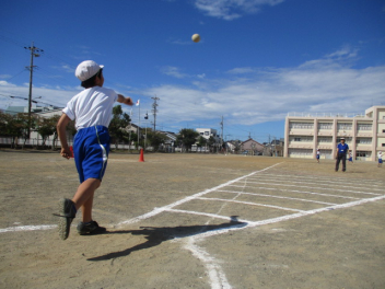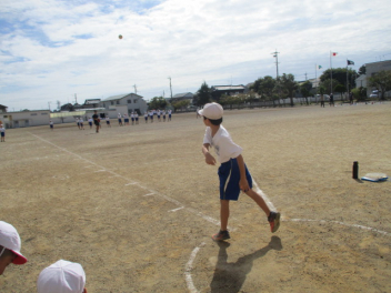 利き手と反対の手を前に向けて、体をひねりながらボールを投げる2年生。教えてもらったとおりに頑張っています。少し、上をねらって投げるのは難しいようで、先生たちの「もう少し上に向かって!」の声が多く聞こえました。