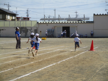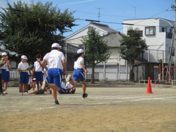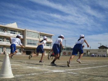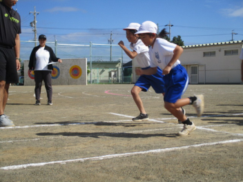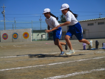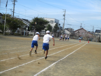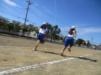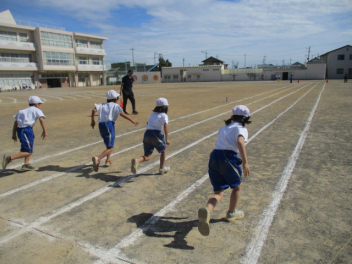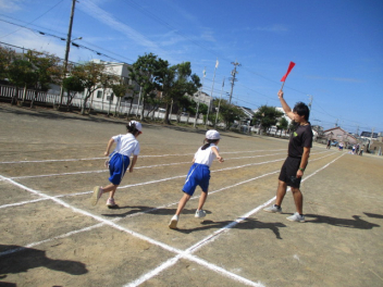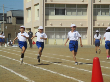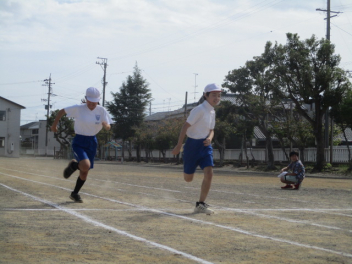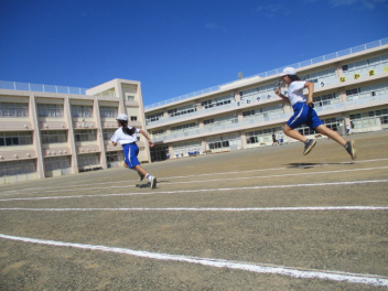 気持ちのよい青空の下、1回勝負の50m走。全員全力で頑張りました。