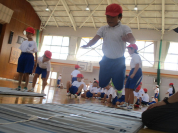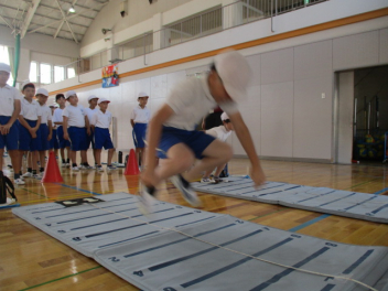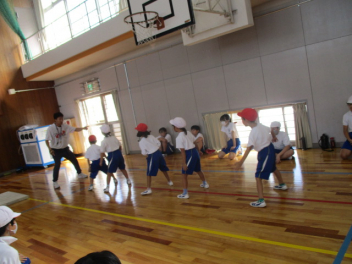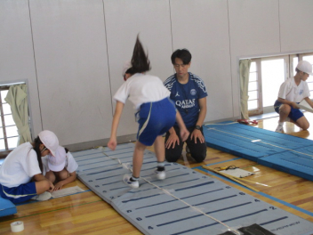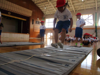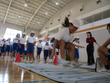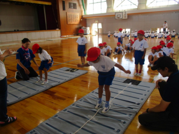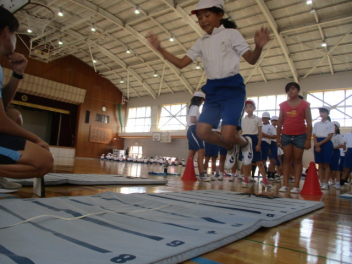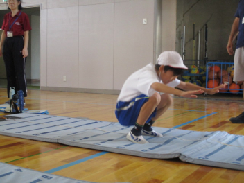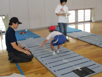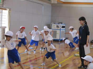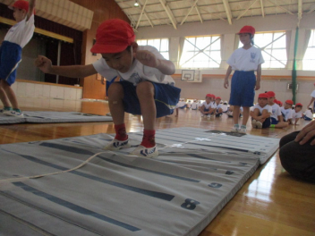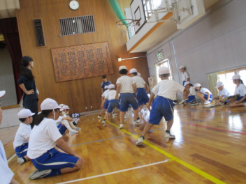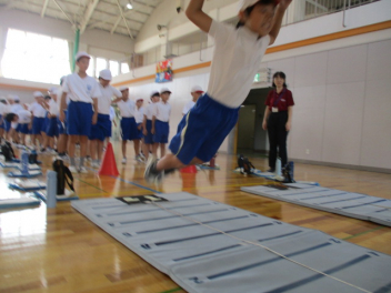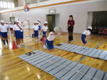 「反復横跳び」は、6年生のお兄さん、お姉さんに数えてもらいました。ラインをふんだりまたいだり、リズムよく動くことができました。