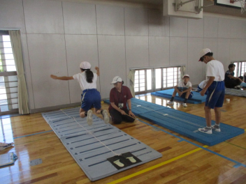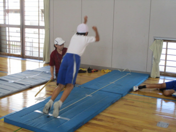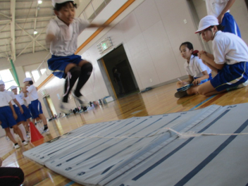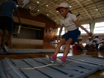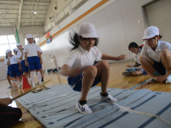 5年生の立ち幅跳びは、迫力がありました。体全体をつかって大きく跳んでいる子が多かったです。応援する声も聞こえ、あたたかい雰囲気での測定となっていました。