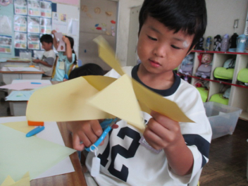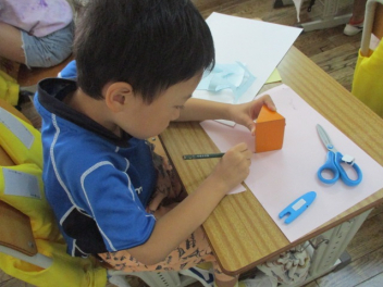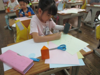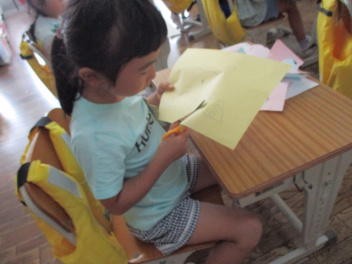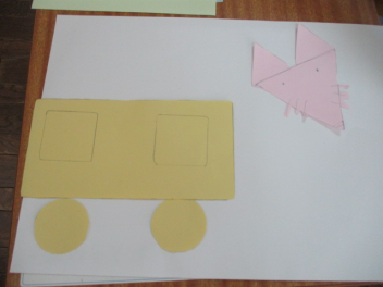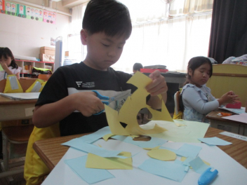 1年生は、「かたちランド」という学習で、形をうつしとって切る活動をしていました。どの子もすごい集中力で作品作りに取り組んでいました。丸や三角、四角をうまくつかって動物や車などつくりあげていました。