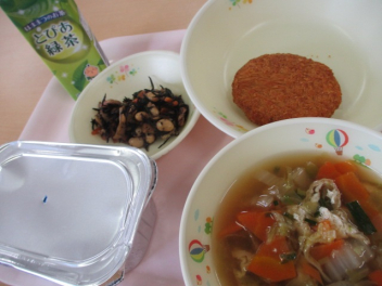ハンバーグのきのこソースを期待したのですが、こちらはケチャップソース。手づくりのやさしい味がしました。きのこは、クリームスープの中にたっぷり入っていました。