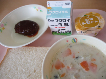 【献立】食パン、煮込みハンバーグ、きのこクリームスープ、なしゼリー
