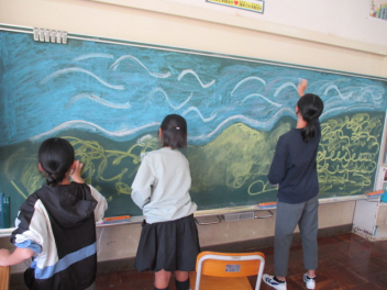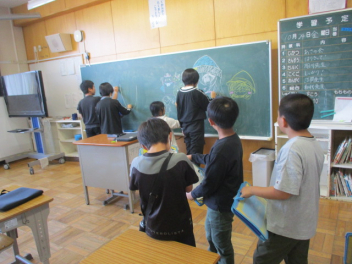 ダイナミックに活動していたのは「まんが・図工クラブ」。黒板アートに挑戦し、思い思いの絵をかいていました。ハロウィンにかかわる絵が多かったように思えます。