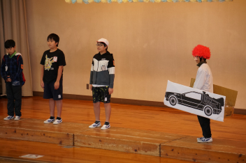 お世話になってはいけない車についてクイズ形式で全校児童に伝えました。