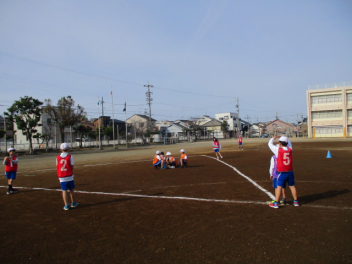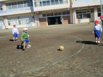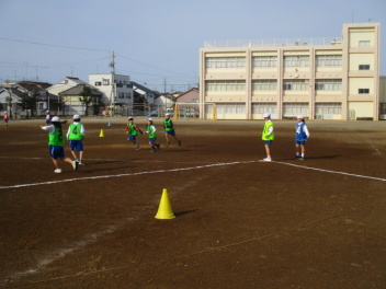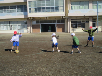 ボールをけったりとめたりするのにもだいぶ慣れてた感じの1年生、二重の円の真ん中の子にパスを渡すゲームに取り組んでいました。周りの子をうまくつかうと邪魔されずにボールを渡せるのですが、なかなか思うようにいかないようでした。それでも、一生懸命友達に声をかけてパスをしようとする姿も見ることができました。