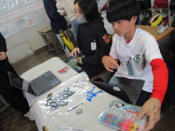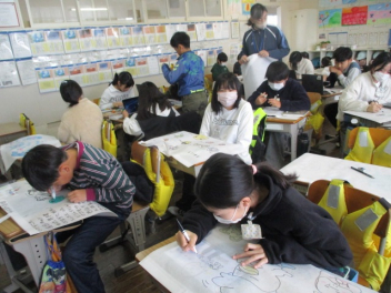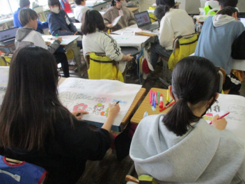授業の様子を見て回っていると、図工の作品を入れるバックに絵をかいている学級が見られました。1年間の活動もひと段落して、お気に入りの絵や言葉をバックにかき入れ、作品の一つとしてつくりあげていました。タブレットを使ってより本物に近い形で仕上げている子が多かったです。作品を持ち帰った際には、バックにも注目してみてください。