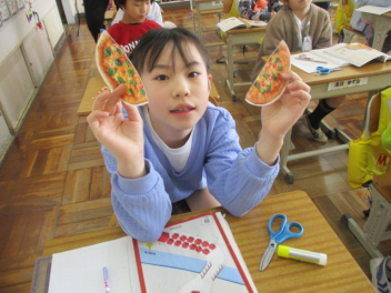 最初のめあては、「半分ってどういうことかな。」でした。ピザや4粒のキャラメル、食パンなどを「半分に分ける」場面を想起させながら、「半分」について考えていきました。「2つがぴったり重なる」という大切なことに気づいた子供たち、「半分」とは何であるか、少しずつ分かってきました。その後、折り紙を半分に切る作業を行い、同じ大きさに2つに分けることであると確認しました。ここで、同じ大きさに2つに分けた1つ分であるので、「二分の一」と言うことも伝えられました。具体物でイメージをもちながら、まずは、「二分の一」ということを学んだ子供たちでした。