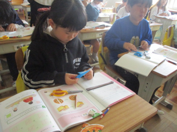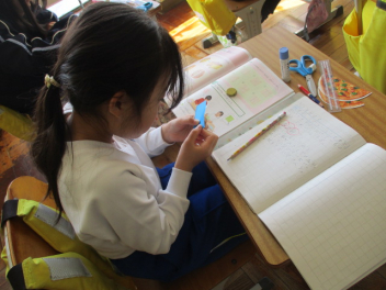 点と点をつないでいろいろな形をかいたり、色板を組み合わせてすきな形をつくったりしていました。棒を組み合わせて形つくりを楽しむ活動も行っていて、1年生のうちに、様々な具体物を操作して感覚を養うことの大切さを感じました。