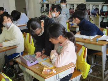 6年生を送る会に向けて頑張っている5年生。理科の学習も楽しそうに頑張っていました。現在は、「電磁石」について学習中。鉄芯などにコイルを巻き付け、電流を流すと磁石になるという「電磁石」、本日は、巻き数によって電磁石の力が変わるかについて実験していました。