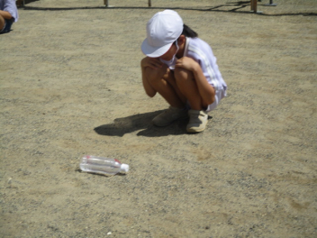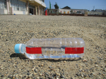 台風のときに、運動場から側溝に向かって水や土が流れていく様子を見ている子供たちは、雨水が流れていくことは分かっています。ただ、平らだと思っていた運動場は果たして傾いているのか調べてみないと分かりません。そこで、ペットボトルで水平器をつくって、運動場の傾きを調べました。