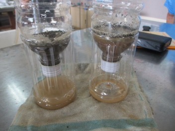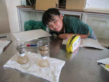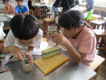 それぞれの、手触りや粒のおおきさを確認した後、実際に水を入れて確認しました。