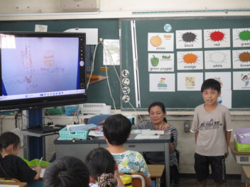 •  3年生は、外国語活動の学習で、Unit4「I like blue.」のまとめを行いました。