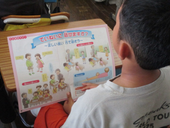 いろいろできることが増えた1年生。「あなたは どうかな?」と、姿勢や手の挙げ方など、日常生活の中での基本的な行動についてイラストを見ながら確認をしました。