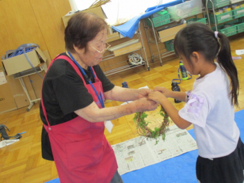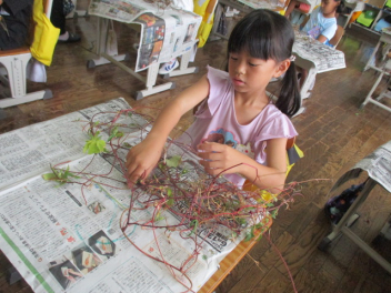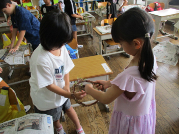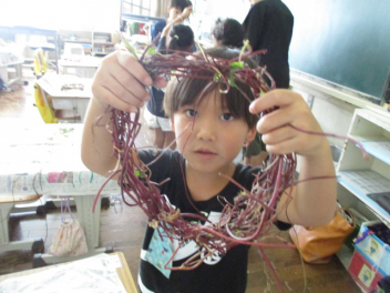 •  花の会のみなさんのおかげできれいな花を咲かせたアサガオも今は、つるのみとなっている子が多いです。本日は、そのつるをつかってアサガオのリースづくりを行いました。