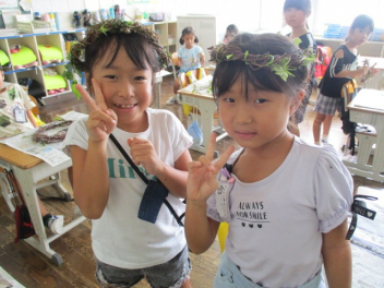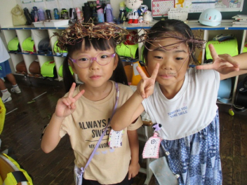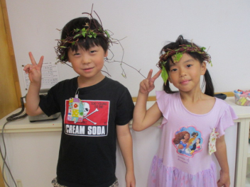 リースを頭にのせてみんなとてもうれしそうでした。この後、きれいに飾ってリースが完成します。