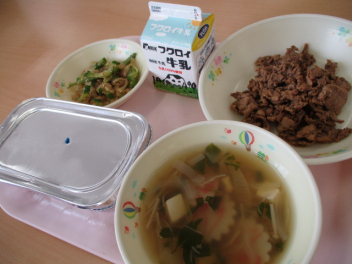 御飯、牛乳、豚肉の浜納豆ソースいため、大根のサラダ、すまし汁