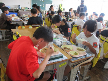 豚肉の浜納豆ソースいためには、浜松市で昔からつくられている調味料の「浜納豆」が使われています。コクのある味が豚肉とよく合い、どの子もおいしそうに食べ進めていました。大根のサラダの大根やすまし汁に入ったみつばは浜松市で多くつくられています。また、すまし汁には、富士山の形が入ったなると巻きも入っていました。