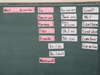 まずは、今まで学んだことの振り返り。繰り返し声に出すことで、楽しく定着を図ります。8か月間で本当にいろいろな表現の仕方を学びました。